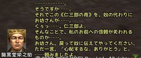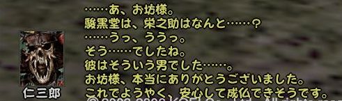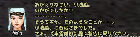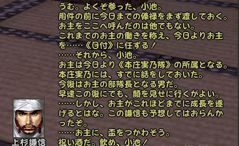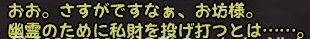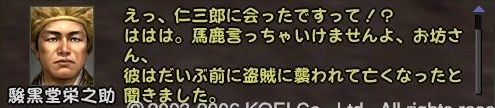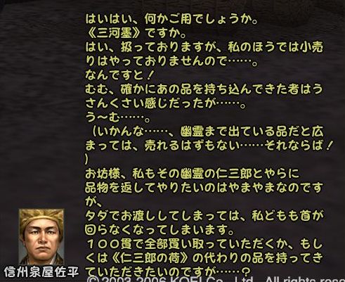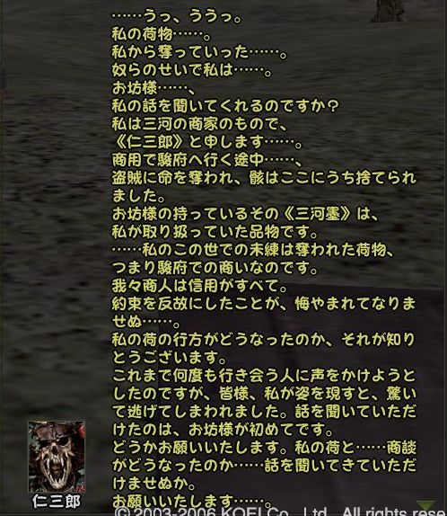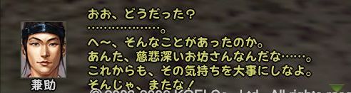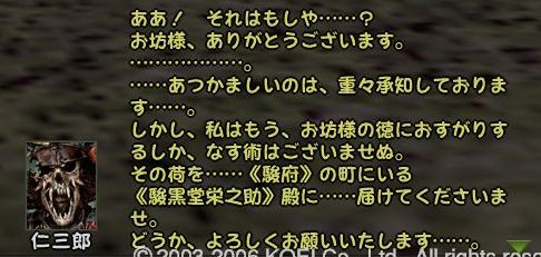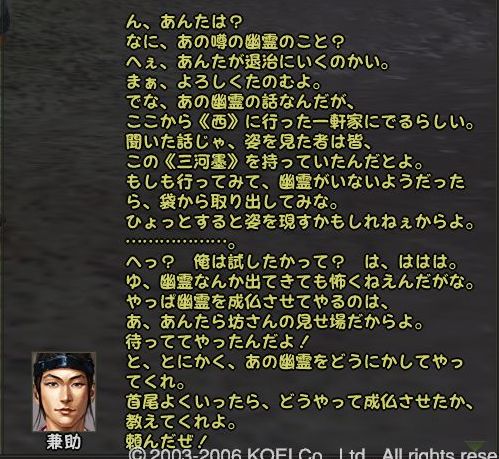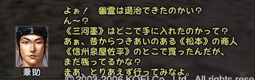 であることなど小さなことであった まずは兼助という男を捜すことからだ 広い遠江のどこにいるのか 馬屋に降り立ち途方に暮れる小池 が、馬屋の程近くに兼助はいた まずは幸先のいいスタートである どうにも軽い兼助から墨を預かり一軒家を探す 西のほう西のほう・・・ 話は軽くワープし、到着^^; 場所はこのへんにある一軒屋 言われたとおりに墨を取り出してみると あっさりと幽霊が現れる こんな選択肢になるのだが 戦力の無い小池としては話を聞くよりない なんかややこしい話になってきた 次の舞台は駿河だろうか とりあえず、兼助のもとへ戻る 次は松本らしい・・・ 上杉家に所属する小池にとって そこもまた敵地 どうにも幽霊バスターズも一筋縄ではいかないようである 問題の男はここにいた お金を捨てるのも嫌いだが やはり戦のできない小池は すかさず金で解決 やったやった 喜び勇んで仁三郎の元へ報告に帰る小池 あ、やっぱりまだあるのね 明らかに使いっぱしりである 問題の商人はここにいる なんだかちょっといい話? そして再び遠江の仁三郎のもとへ というわけで、どうも話は解決したらしいので 依頼主に報告 これで、マラソン生活ともおさらばだぜ~ というわけでめでたしめでたしなわけです どうも順調すぎて気持ちが悪いが ネタが無い ことを除けば万事良し 今まで城代しか見てなかった小池としては初めての御館様 春日杯で乾杯でござる 今回も大変だったけど 優しい仲間に援けてもらうこともなく 一人でデキタ それにちょっといい話だったので なんとなく満足な小池であった PR