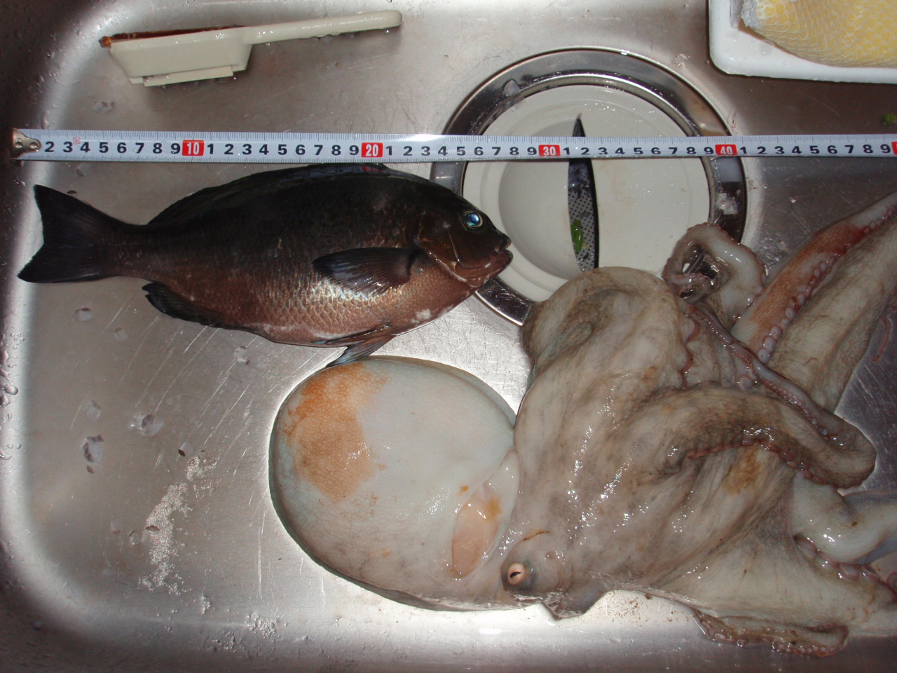 とは言っても、あまりに良い天気であったため、日焼けが主、釣が従である。 「別に釣れても釣れんでもよろし」 と、余裕をぶっこいている割には、10時の開店を待って上州屋に飛び込み、ウキやら、チヌパワーやら、セールだったフロロ糸やら買い込む始末。 めっちゃやる気満々でんがな。 今日の釣りは、以前に買って放置されていたダンゴ餌を使ってのダンゴ釣り。 チヌ(クロダイ)狙い。もう、これしかない。 さて、とにかく良い天気である。 というわけで、釣り場につくなり上半身裸。 ここは、よく海上保安庁の船が通るので、もしかしたら、逮捕される予感さえする姿である。 しかし、まぁ、あれね。 ダンゴ釣ってのは体中 粉まみれになるのが難点。 汗を拭おうとすると顔が粉にまみれるという罠。 というわけで、過程は華麗にスルーして結果は なぜ、タコ? 隣でタコ狙いのお父さんが「釣れんのぉ」とボヤいているそばから、チヌ狙いの若者がタコ釣っていいのでしょうか。 さて、こいつ(このタコ)にはちょっと因縁がありまして。 釣の最中、根がかりしたんですわ。 俗に言う「地球を釣った」という奴ね。 うんともすんともいわんから、まぁ、ハリスを切ったわけですわ。 まぁ、よくあることなので、ハリスと針を交換し、釣り再開。 そのあとしばらくして、ウキに反応が。 「おりゃ」っとあわせてみると・・・・また根がかり? と思いきや、重いながらも動くんですわ。 こういうときは、貝か海草でも引っ掛けたか、タコですわ。 わらわらお父さん達が集まる中、あがってきたソレがコイツですわ。 「お~ 大物やの~」 のお父さん達の嬌声を浴びながら、とりこんだタコから針を外そうとしたわけですわ。 ん? なんか針が2本かかってるんですわ。 1本は当然、今ひっかけた奴やねんけど、もう1本、ちょろっと糸がついただけの針が刺さってるんですわ。 それも、そこはかとなく見覚えがあるというか・・・・・・・・・・・・・・・・・・・・・・・・・・・・・・・・・・・・・・・・・・・ ・・・・・(゜∞゜)y-゜゜ !∑(゜∀゜) って、会長の針やん!? つまりさっき根がかりと思って切った針。実はこいつのシワザだったんですわ。 まぁ、なんと言いますか、根がかりにも五分の魂ということで(なんのこっちゃ) おしまい。 PR