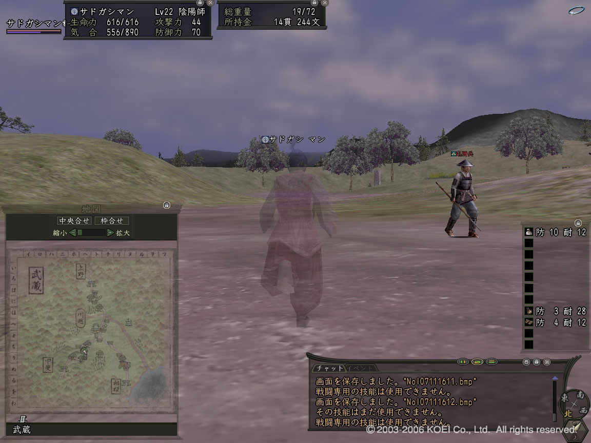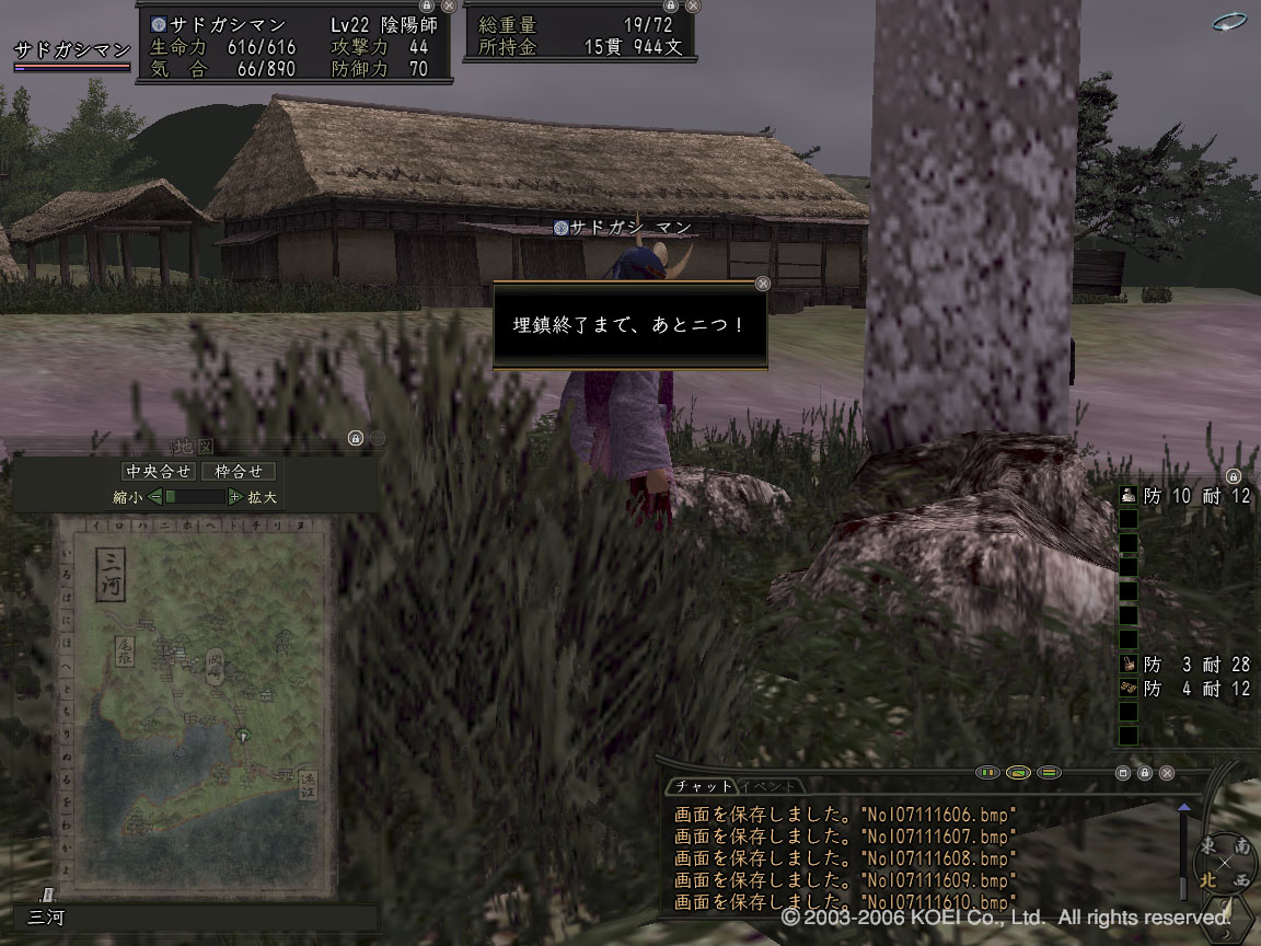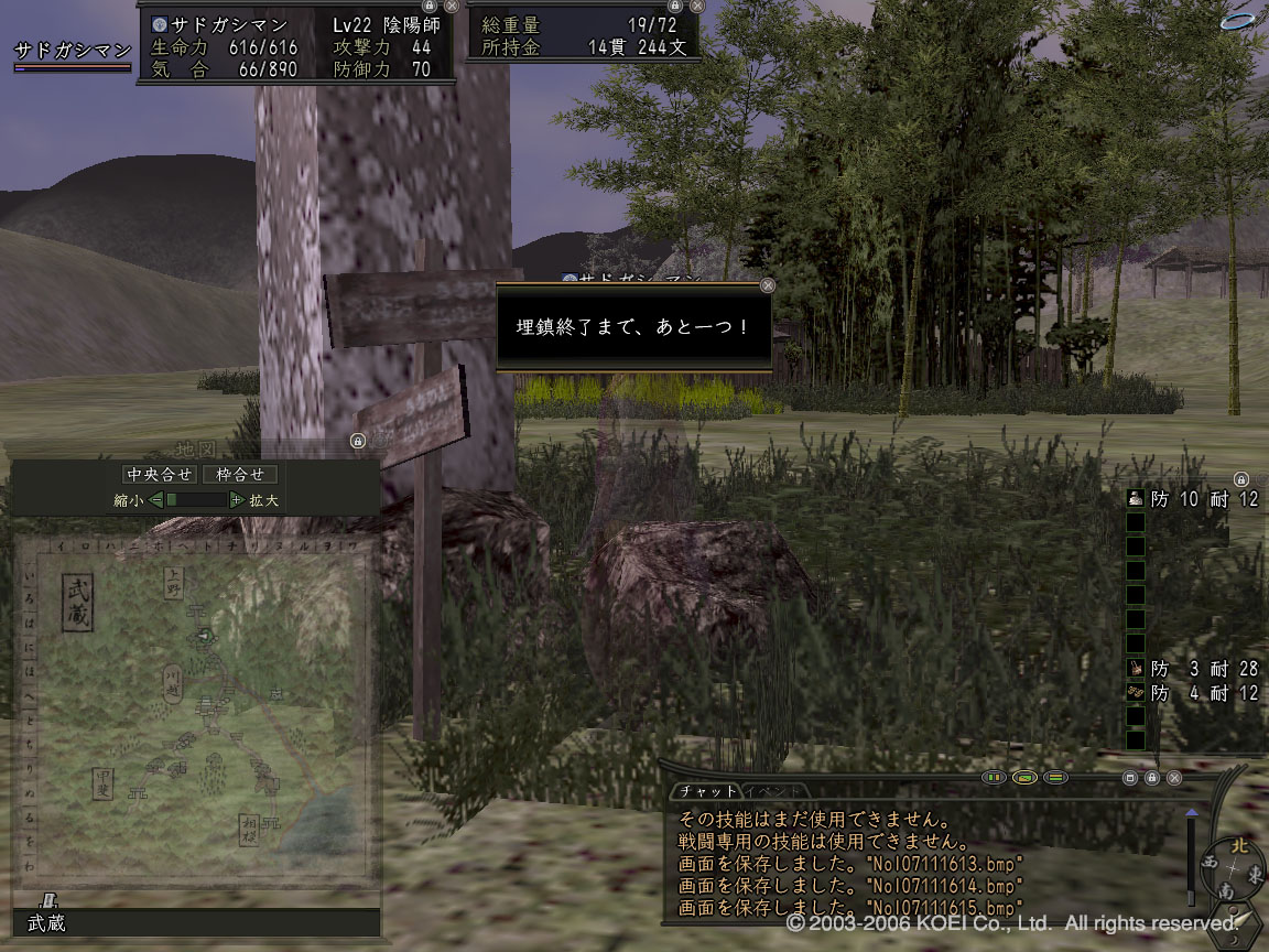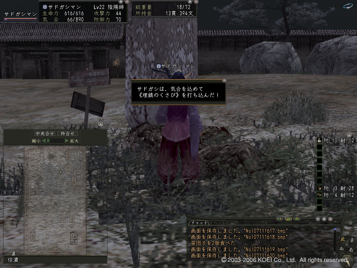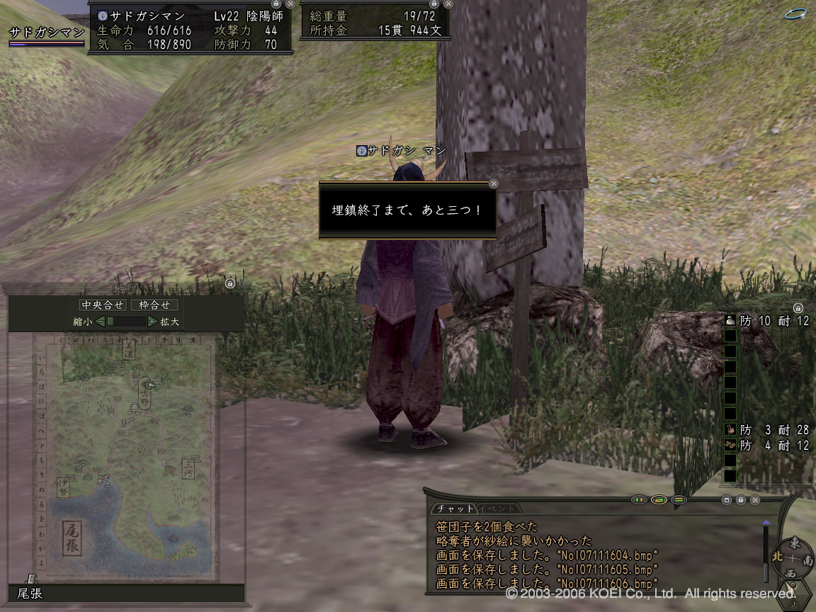 11/17/01:07 【駆けずり回る青春2】やあ、美濃の大盗人様だよ。 近頃は隠れ里なんてもんができて、すっかり平和になったもんだぜ。 というわけで、美濃からこんにちは。 里からの集団就職組の一人、陰陽師「(離島戦隊)サドガシマン(22歳・独身)」の侍大将試験をやってきた。 与力試験はどうした。という話題は何の記録もとってないので、華麗にスルーし(術かけた短刀で殴りまくりましたよ、ええ)陰陽師の侍大将試験とは 「私が指定する5カ国内にある どれかの道標に渡された楔を打ち込んできなさいよね!」 というものである。 つまりどの国が選択されるかによって、少々難易度と面倒くさい度が定まるわけで、運命の分かれ道なのである。 そして与えられた5カ国とは、美濃・尾張・三河・信濃・武蔵 というものであった。 越後上杉家にいるサドガシマンにとって、尾張と三河は同盟軍の地、美濃は疎遠、残る信濃と武蔵は敵視・敵対というチョイスである。越後から近いという点は利点だが、敵国の道を走り回るというのは苦戦が予想された。 世界平和を夢見るサドガシマンの作戦は、 1.美濃との関係は疎遠に改善したばかりで、いつ敵視に落ちてもおかしくないので、さっさと行ってしまう。 2.美濃を走り回ったら、隣国の尾張・三河と攻め上る 3.どこでもドア(早馬)を使い武蔵に乱入 4.しめに信濃をマラソンし、そのまま越後に帰還 というものであった。 まぁ、結論から言うと、なんのネタもなく終わってしまい、話としてはなんの盛り上がりもない。 |